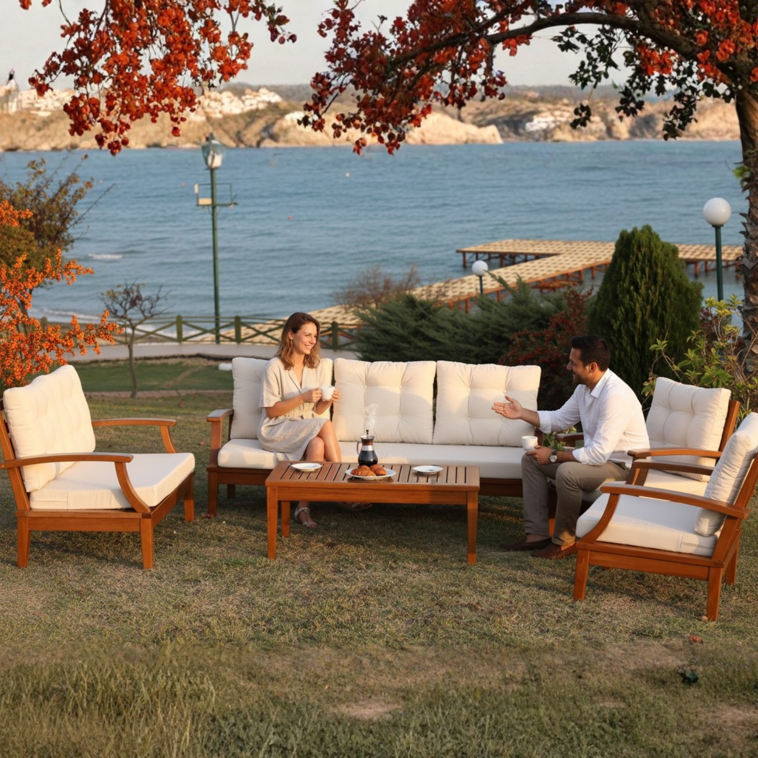 Su bazlı, sertifikalı yüzey korumalarıyla yağmura, neme ve güneşe karşı üstün direnç. Dört mevsim boyunca kalitesini koruyan premium dış mekân mobilyaları
